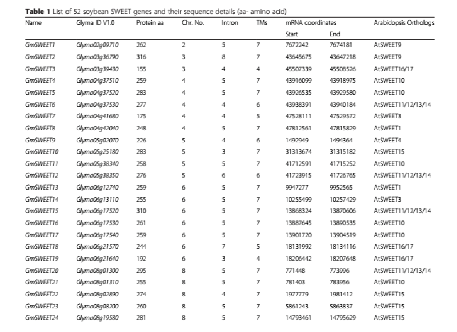 Patil G. ?et al. Soybean (Glycine max) SWEET gene family: insights through comparative genomics, transcriptome profiling and whole genome re-sequence analysis. BMC Genomics. 2015