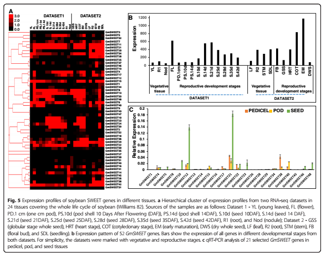 大豆研究套餐: 整個(gè)多個(gè)大豆RNA-seq公共數(shù)據(jù),分析SWEET基因家族在大豆生殖組織與營養(yǎng)組織間表達(dá)變化規(guī)律