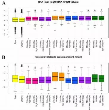 為了探索mRNAs甲基化是否與翻譯有關,作者把mRNA甲基化數據與Smits等人已發(fā)表的轉錄組和蛋白組數據進行了整合。通過BLAST分析,在RNA/蛋白數據中找到了723個m6A修飾mRNAs的信息。GV期或者MII期卵母細胞中高m6A峰的RNA水平(log10 RNA RPKM值)比總RNA高(在卵或者胚胎中),但是蛋白水平(log10 protein amount / fmol)比總蛋白水平低(Figure 2)。與高度甲基化的mRNAs相比,低甲基化RNAs顯示出非常高的表達水平(Figure 3)。這些結果說明在卵母細胞或早期胚胎中,m6A修飾可能與mRNA翻譯有關。