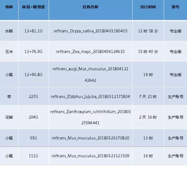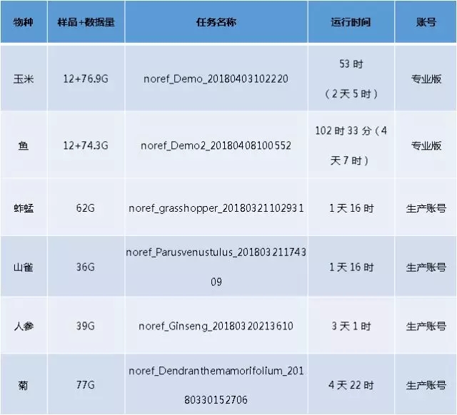 無參轉(zhuǎn)錄組分析數(shù)據(jù)表明,12個玉米樣本共76.9G,專業(yè)版賬號中最快可以在2天5小時完成交付。而在生產(chǎn)賬號中,山雀(36G)和蚱蜢(62G)最快可在1天16小時完成分析。