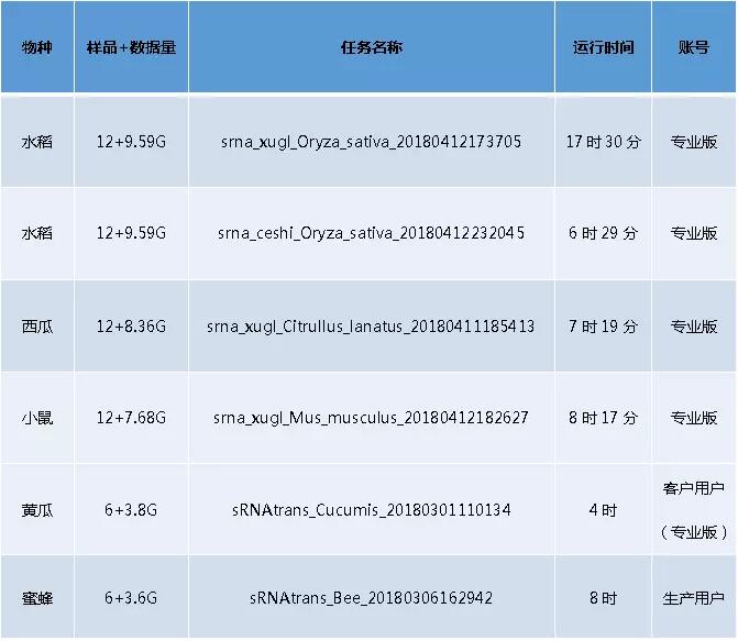 sRNA分析數(shù)據(jù)表明,水稻12個樣本,共9.59G,在專業(yè)版賬號中最快可以6小時29分完成分析。另外,在客戶專業(yè)版賬號中,6個黃瓜樣本,共3.8G數(shù)據(jù),最快4小時完成分析任務(wù)。