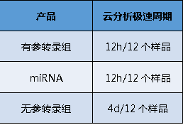 百邁客轉(zhuǎn)錄調(diào)控三大產(chǎn)品有參轉(zhuǎn)錄組、無參轉(zhuǎn)錄組和miRNA已實現(xiàn)以下云分析極速周期: