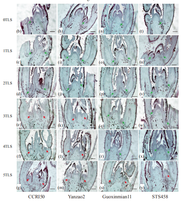 陸地棉(Gossypium hirsutum L.)是世界上最重要的纖維作物。在我國(guó)黃河流域和長(zhǎng)江流域棉區(qū),實(shí)現(xiàn)早熟棉在小麥或者油菜后直播可以提高復(fù)種指數(shù)。而在西北內(nèi)陸棉區(qū),春季氣溫低,秋季枯霜早,早熟棉既能提高棉花的霜前花率,還可以改善棉花品質(zhì)?;ㄑ糠只怯绊懚碳久奁贩N早熟的重要性狀,是棉花現(xiàn)蕾期、開花期和成鈴期發(fā)育的基礎(chǔ),花芽分化直接影響開花時(shí)間?;ㄑ糠只侵参飶臓I(yíng)養(yǎng)生長(zhǎng)向生殖生長(zhǎng)過(guò)渡的標(biāo)志。當(dāng)進(jìn)入生殖生長(zhǎng)時(shí),側(cè)芽變成花芽,花芽發(fā)育成果枝。果枝分化決定了開花量、生殖能力和棉花產(chǎn)量。因此,早熟性狀及早熟棉品種在生產(chǎn)上顯得尤為重要。