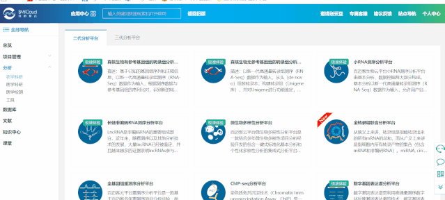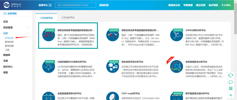百邁客云包含農(nóng)學(xué)和醫(yī)學(xué)兩大類分析平臺(tái),醫(yī)學(xué)分析平臺(tái)主要針對(duì)人、鼠數(shù)據(jù)的分析,包含:轉(zhuǎn)錄組、非編碼RNA、單基因病外顯子、腫瘤外顯子、重測(cè)序等數(shù)據(jù)分析,以及全轉(zhuǎn)錄組聯(lián)合分析;農(nóng)學(xué)分析平臺(tái)可以應(yīng)用到更多的物種,涵蓋轉(zhuǎn)錄組、非編碼RNA、微生物、蛋白、代謝等數(shù)據(jù)的分析,以及全轉(zhuǎn)錄組聯(lián)合分析等。點(diǎn)擊左側(cè)導(dǎo)航分析->農(nóng)學(xué)或者醫(yī)學(xué)打開分析平臺(tái)列表頁(yè)面,點(diǎn)擊選擇您想要使用的分析平臺(tái),打開其詳細(xì)介紹頁(yè)面,該頁(yè)面可以看到該平臺(tái)的應(yīng)用領(lǐng)域“平臺(tái)介紹“技術(shù)背景“案例“課堂“版本記錄,點(diǎn)擊打開軟件即可進(jìn)入到參數(shù)頁(yè)面。